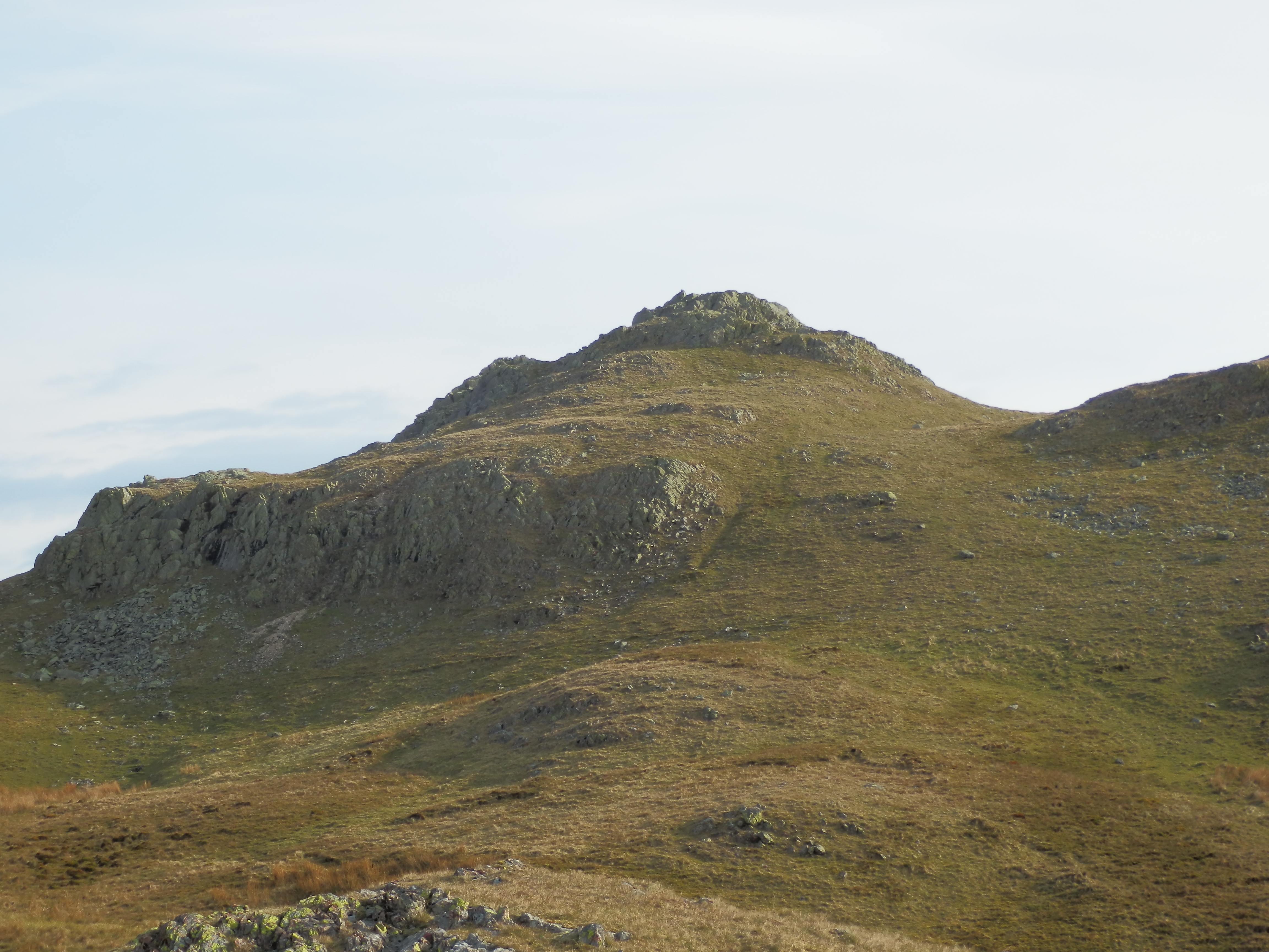 Meanwhile I started up the path onto Glaramara, turning into a bit of a scramble as the rocks become steeper.  I crested the top and headed to the summit shelter, taking a break out of the cold.  While I was there, my lost walker appeared, enabling me to actually point out Allen Crags which was now in sight.  She headed off into the distance. I picked myself up and descended over Looking Steads.  Somewhere along the way I broke my Pacerpole as I’d just got myself down a steep bit when I noticed the bottom of one pole had gone. Bollocks.  And it was totally gone – it wasn’t in sight.  I backtracked to see if I could find it, with no joy whatsoever.  All I had was the stump of the bottom section, and somewhere on Glaramara was the carbide tip and basket.  I knew I had little chance of finding it amongst the rocks and gave up.