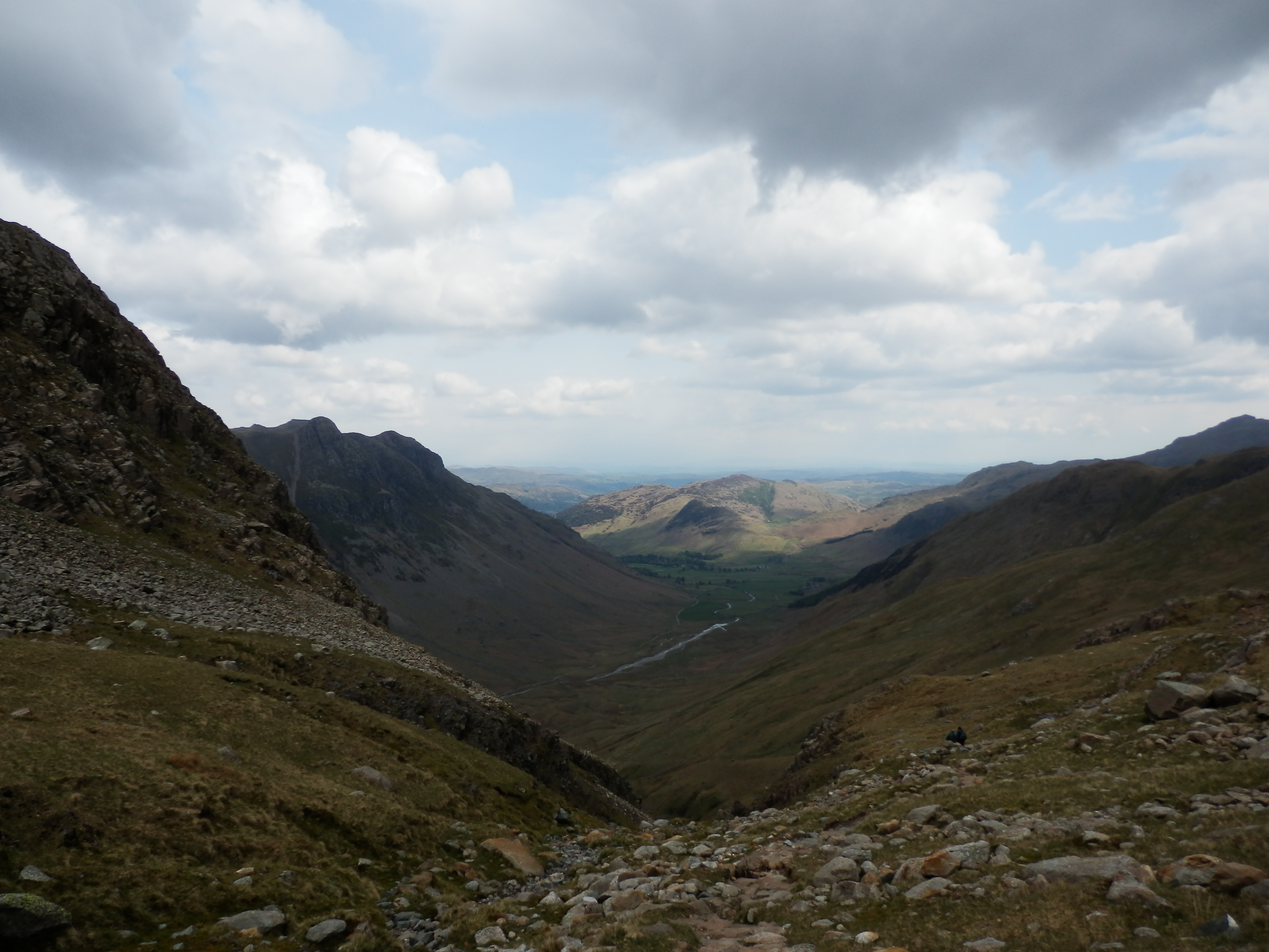 The Rossett Gill path is long and in places a bit rough underfoot, but still vastly improved since my first visit.  It also zigzags down making the path a lot longer than it looks.  Several people overtook me as my legs started to flag.  I reached the bottom and strode out more purposefully along Mickleden.  By now I’d refined my plan and decided that I’d see if there were room in the campsite.  If so, then I’d stay there.  If not, then I’d retire to the ODG for some nosebag before heading up for a wild pitch on Lingmoor Fell. I didn’t mind either way and didn’t feel the need to keep it wild the whole time.  I’d experienced wild camping, coped with finding water and outdoor toilet issues, and the trip so far had been just the right length.  With a flexible ticket and a forecast for wind, rain and cold the next day, I decided that I’d camp low if room and aim for a slightly earlier train the next day, meaning I would get home with a bit of the bank holiday weekend left. If no room, then I’d camp wild, but cut the next day’s walk short.