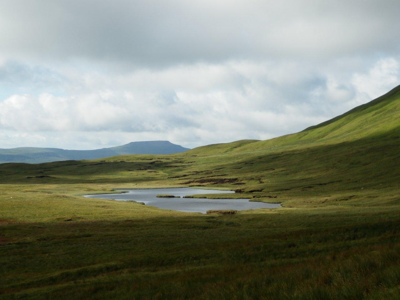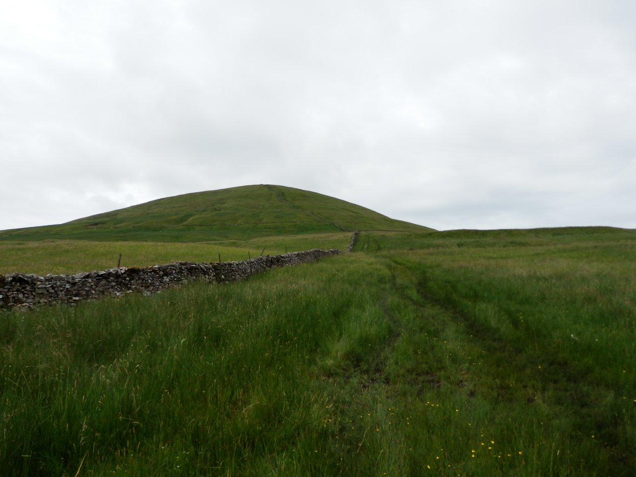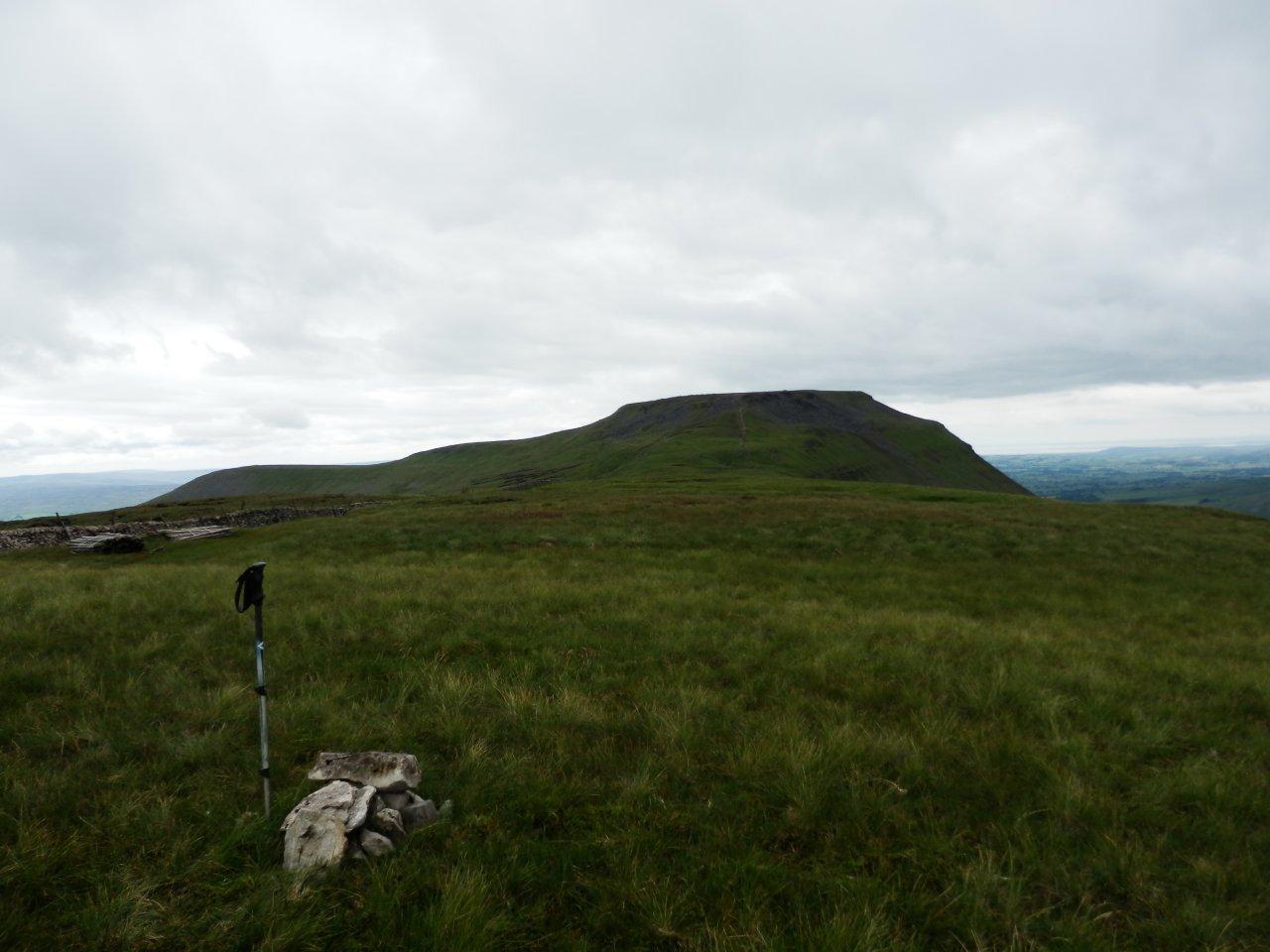 In the distance Ingleborough was now visible, and on this, my third visit, I dared to hope that I might at last get to the summit and find it cloud-free. Â We followed the wall around and onto Simon Fell. Â Now it was my time to be the anorak, as I made a beeline for the pathetic pile of stones that marks the summit of the fell (a Nuttall and Hewitt). On my first visit to Ingleborough, I’d dragged my reluctant father along through the mist and over squelchy ground to bag this top and it had seemed to take forever. Â Today though, with our target plainly visible, it seemed to take no time at all.