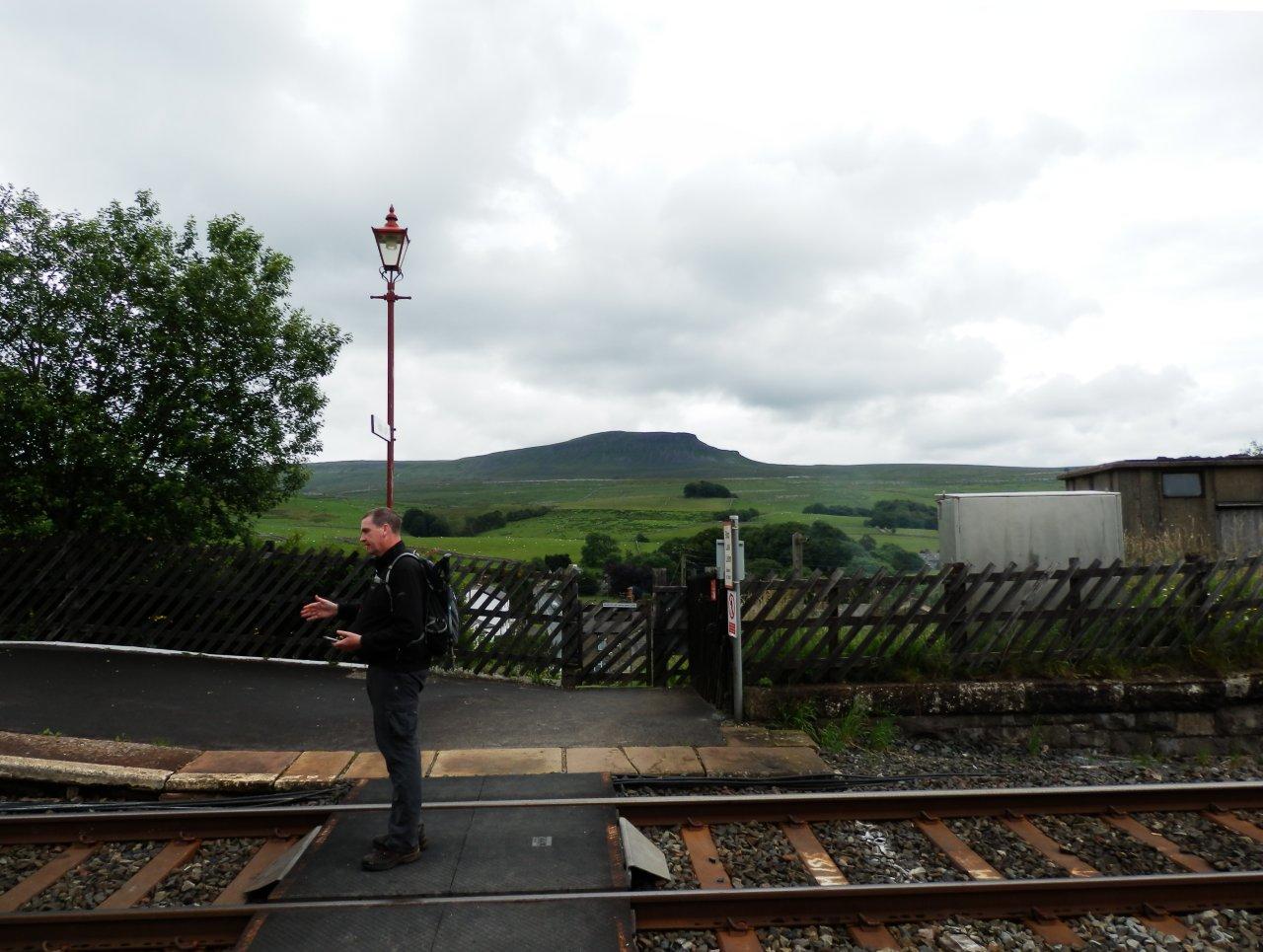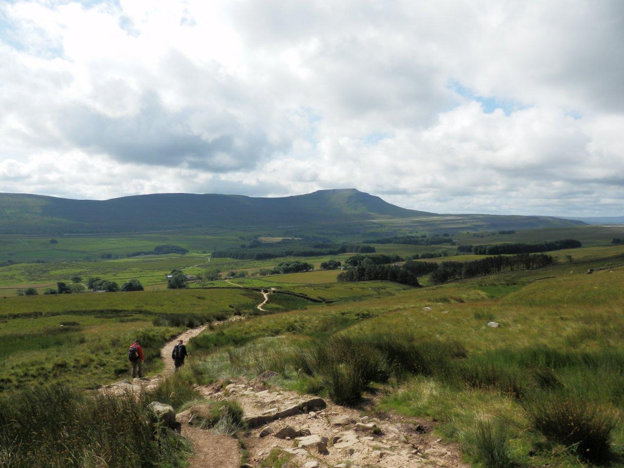 We sat there a while, and watched as Martin suddenly went to greet a couple of guys arriving at the summit. Learning they were his colleagues from the Highways Agency, more minutes passed in conversation, and by the time we stood up to head off, half an hour had passed sitting in the sun. We headed down as the sky darkened over Whernside and a rain shower crept towards us. Â A shaft of sunlight broke out from the cloud to illuminate Hull Pot and I managed to miss this open goal of a photo opportunity. But Martin was alert and got one, so best look at his pictures. We descended steadily along the Pennine Way to Horton, stopping occasionally for Stuart to photograph a stile and for all of us to look at scenery along the way.