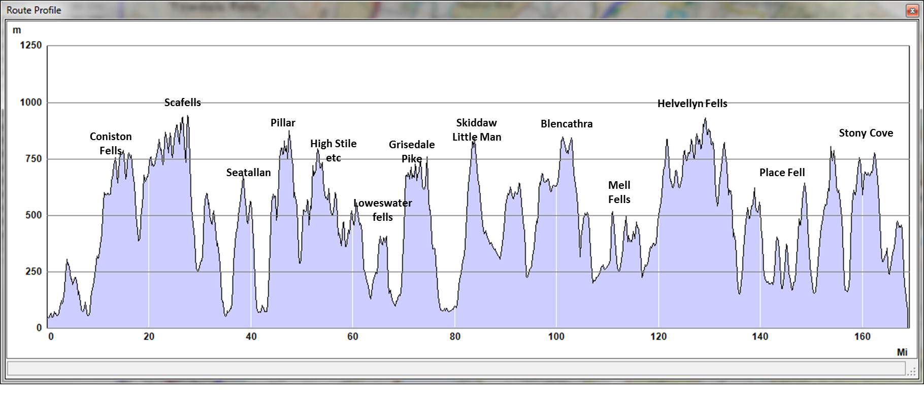 Having thought this route up, I’m now seriously considering doing it, not necessarily in one go, as a means to pick off my remaining Wainwrights. Provided I start and stop at any of the 5 lettered places, then it’s easy to do. Three trips to the Lakes is what I reckon it will take to do and it’s seriously tempting as a target to do this year. But first I need to think about the Cambrian Way, which is my main priority, and it’s likely that I’ll only get one trip in as training before that. It’s then a matter of how things pan out.