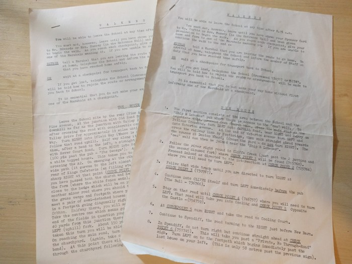 Recently I unearthed a couple of sets of typed route instructions for sponsored walks I did at school in the late ’80s. I remember these being in the region of 20 miles, which I polished off fairly easily, which was nice because I was at a sporty school and was crap at most of those sports. I remember feeling slightly smug being one of the only kids with proper walking boots. I remember feeling less smug when my Dad was operating on my heels to pop the resultant blisters, a job he botched so much I still have rough skin there to remind me of those days.