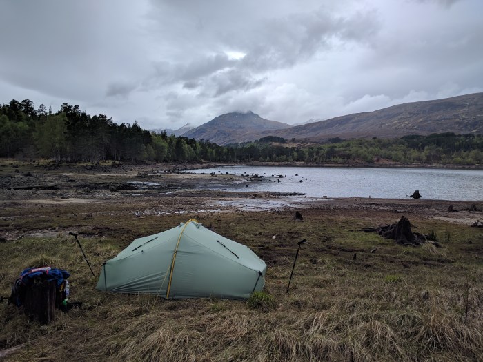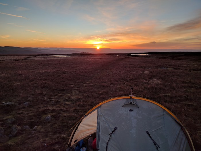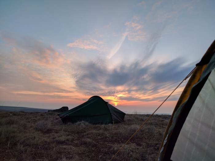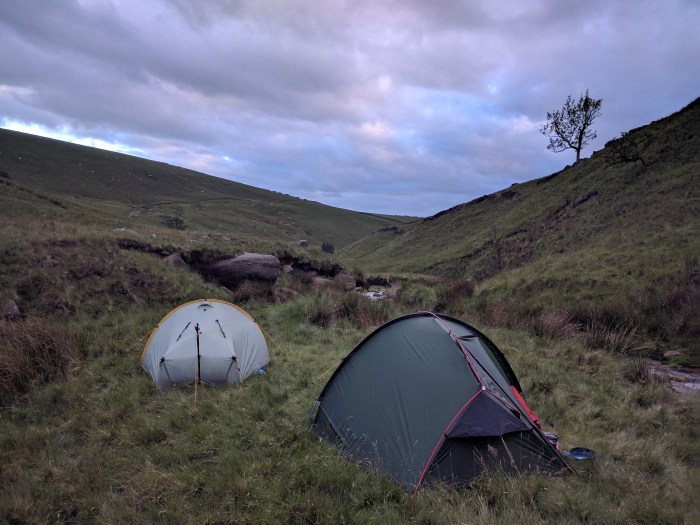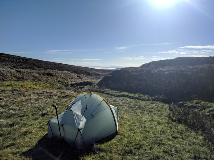 In my case, it was a night in a bothy. Rebecca argued that as no tent was involved and I was indoors it didn’t count at all. On my side, I was sleeping on the floor, and there was no toilet or running water, so it was arguably almost a full wild camp. We compromised on counting it the same as a tame camp (so 0.5 point for me).