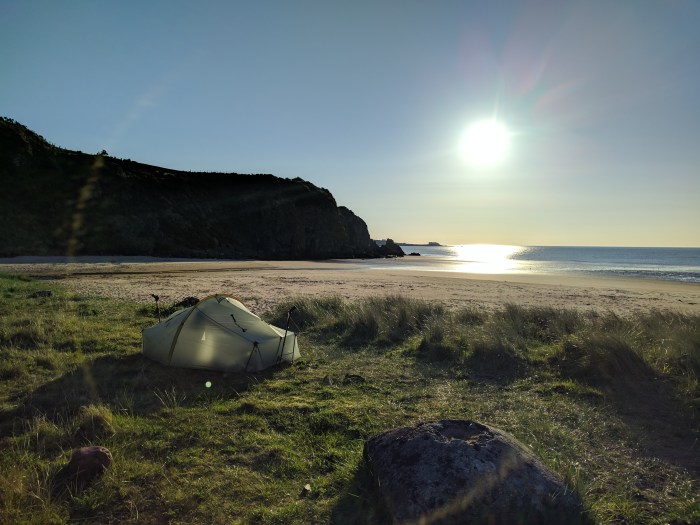 I made it to the coast at Lunan Bay and decided to camp on the beach. A great night, buoyed by the knowledge I’d just walked across Scotland, a nice sunrise. Camp of the year.