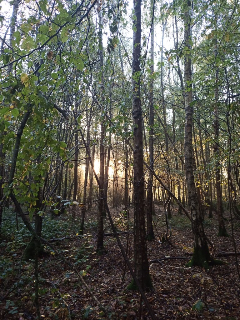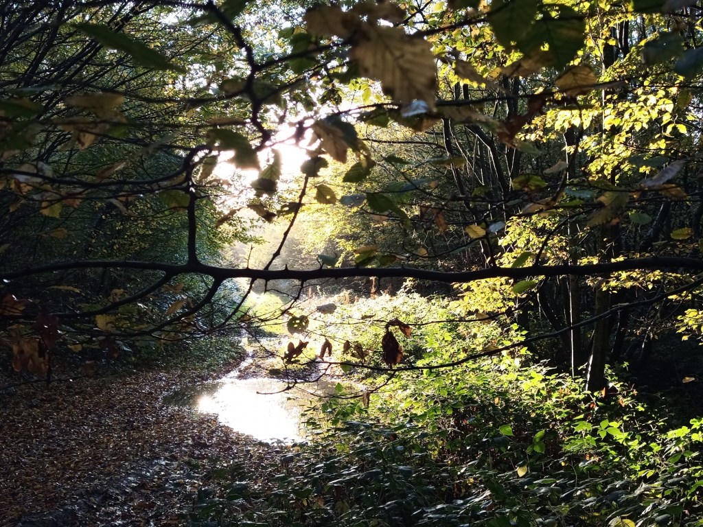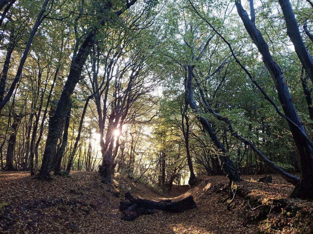 I packed up soon after sunrise, and meandered through the forest, having the place to myself, and watching the sunlight playing on the branches. I reached the point where I needed to turn and head down to the car and did so, a sunlit holloway being my path.