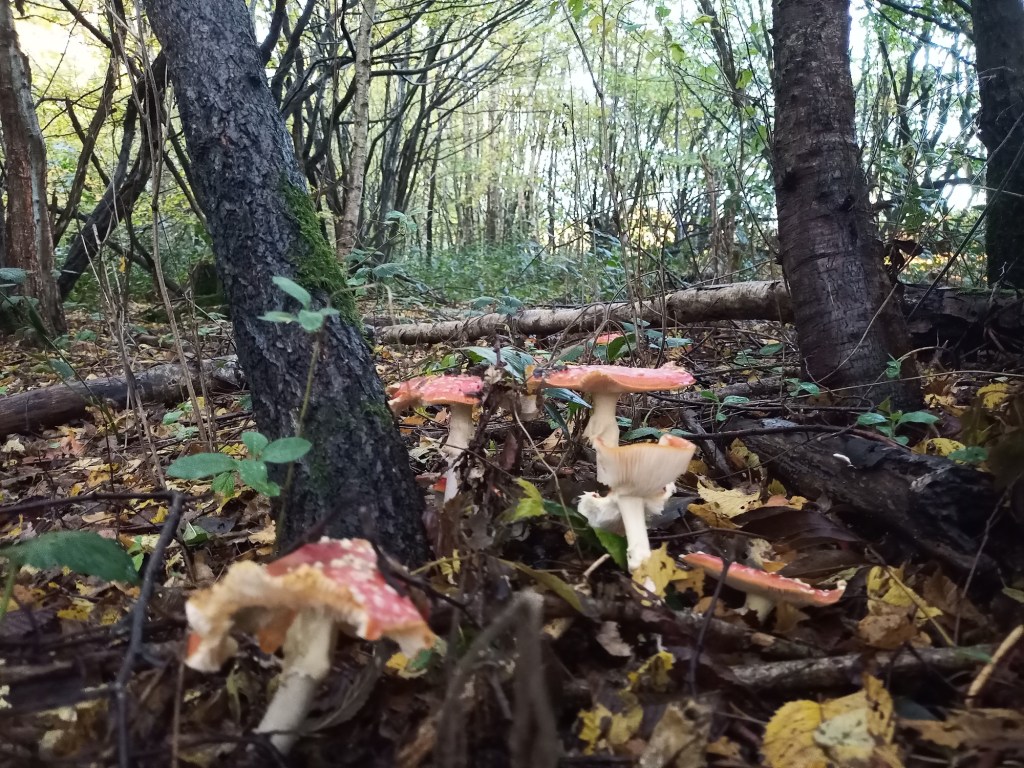 The side paths yielded some delights in the form of deep puddles with perfect reflections and a patch of red-topped toadstools