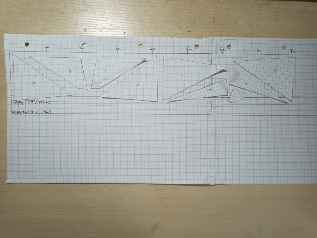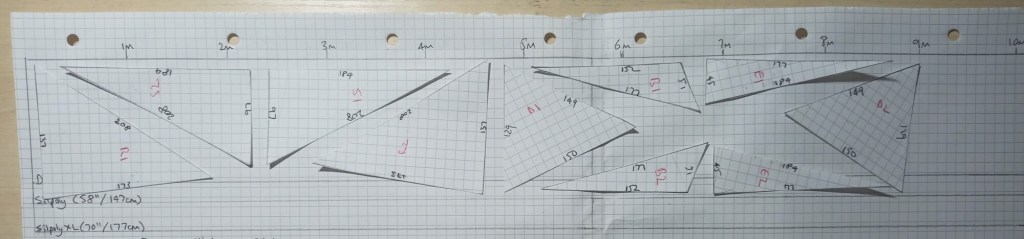 The paper prototype is also a good way of planning how I’m going to cut out the shapes from the actual roll of material. I create a long piece of paper at a suitable scale to represent the suppliers’ material widths (in this case, I drew widths for 1.1oz Silpoly, 1.1oz Silpoly XL, and DCF). I then simply cut out the design at the same scale and arrange them on the material width plan. The idea of course is to get them to fit efficiently, but also plan the orientation in terms of the weave of the cloth. Enough space needs to be allowed for seam allowance etc, and a bit of extra length of material for contingency.