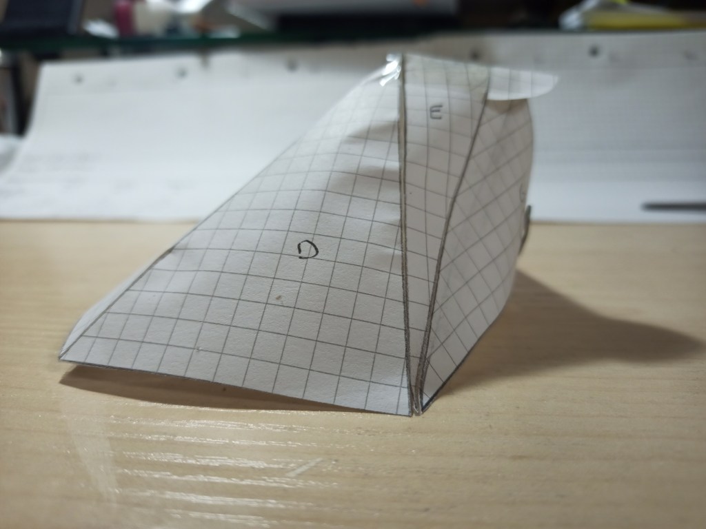 At this scale (1cm on model = 20cm of real thing), it’s fiddly to join, and using sellotape means the sides don’t necessarily hang at the right angles: the beak in particular. But it’s enough to confirm that geometrically it works (which it should do given I’ve used CAD to design it).