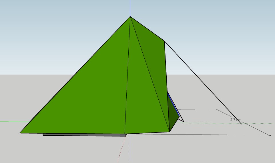 Next I added the two inverted triangles that form the beak, using the same approach as originally – square it off at the front, and find the right angle to drop down at by trial and error. The beak top line is then a compromise of length, angle from the top of the shelter, and it also needs to work for attaching a front guy.
