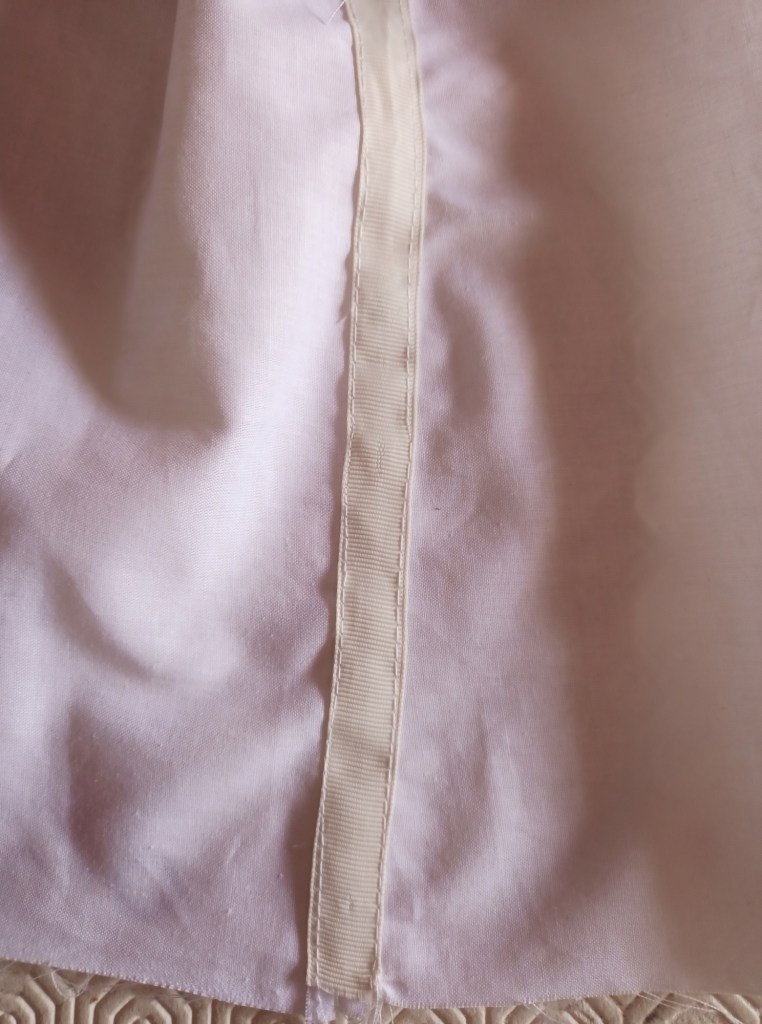 We probably won’t continue with this idea. But the alternative is a felled seam that is slightly off-centre. Whether that will matter when working at full size, we’ll work out along the way. It may be, of course, that the grosgrain seam thing will be easier and more effective at full scale. The larger prototype that I make next will use the flat felled seam – partly because of my (lack of) skill level, and also as a point of comparison.