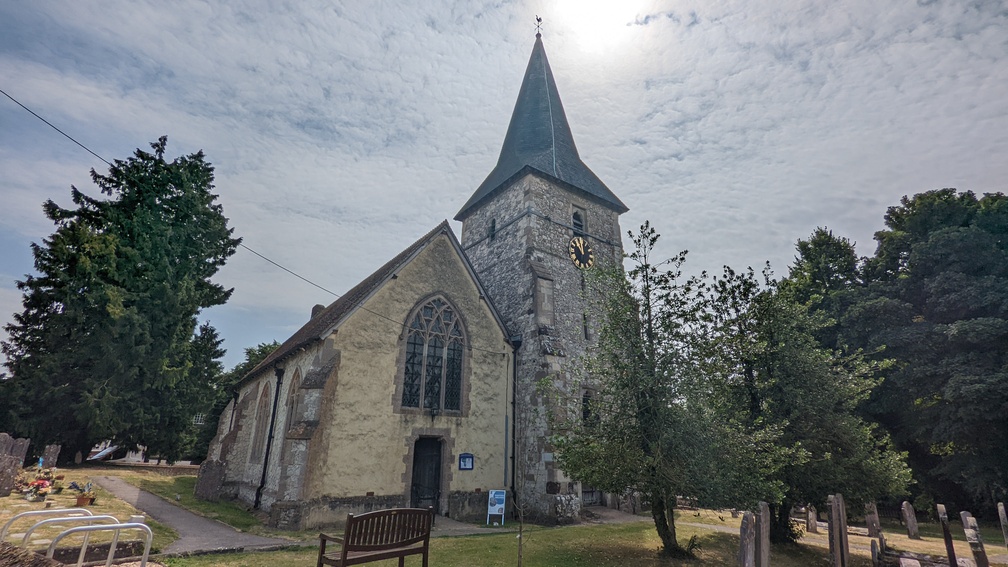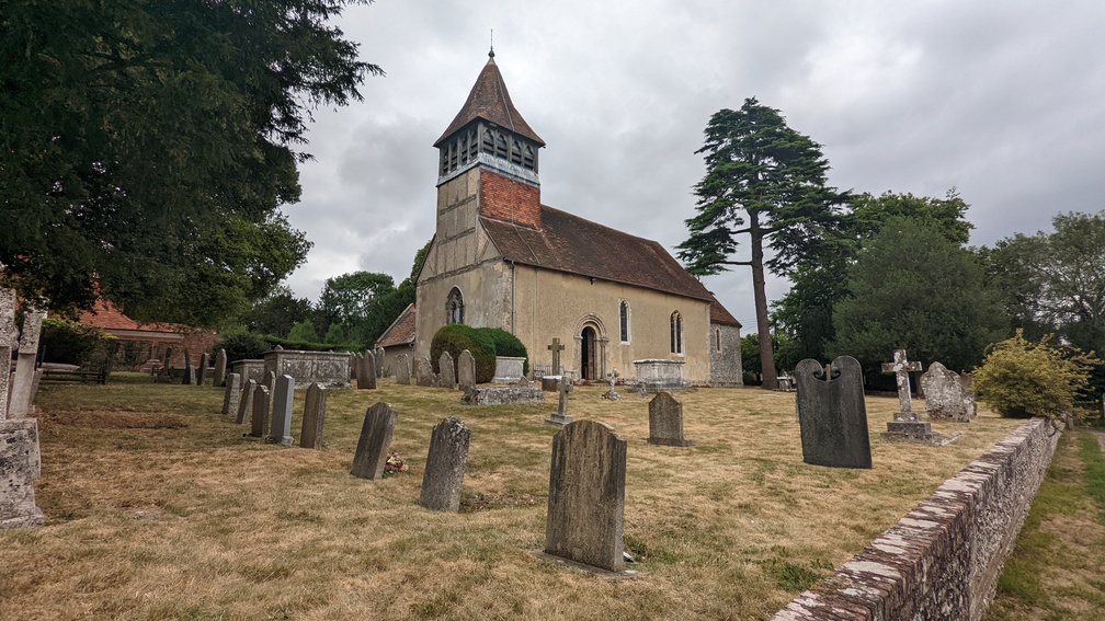 Under the M3 and a pleasant walk into Martyr Worthy, with a really nice church. And a bench outside, making for a good rest stop.