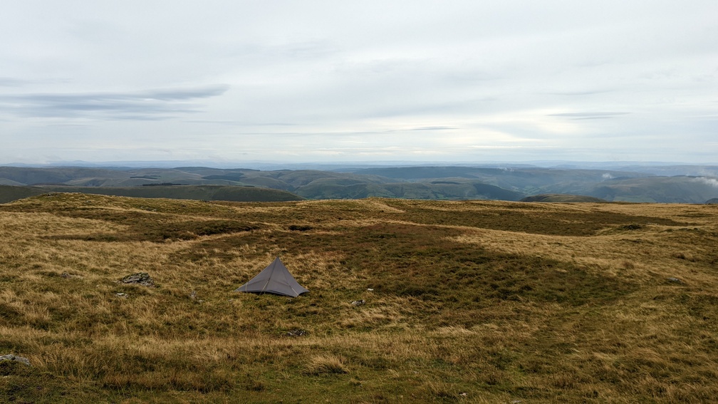 It was now time to stop for the day, and I spent over half an hour scouting around for a good spot, rejecting several due to lack of shelter, lack of flatness or lack of views. Here I made the mistake of looking for shelter from the northwesterly wind, despite knowing it was due to drop away to practically nothing. Because of this I found myself shelter in the lee of the summit outcrop with a not very satisfactory view over Llyn y Fign. If only I’d been braver and pitched right at the summit, but end of the day fatigue clouded the decision-making. I’ve been walking on the flat for too long recently.