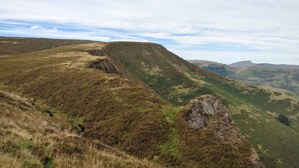 Next up was Craig-las (Tyrrau Mawr) which was also quite a nice summit. At the bwlch I looked up at Craig y Llyn, the final mountain on the ridge, and really didn’t feel like doing it. The route I’d intended goes over that hill and sweeps around to join a gentle track down, but suddenly I was confronted with a waymark pointing straight downhill. I’d forgotten that the official route goes straight down here. It didn’t take long to decide to take that short cut. In so doing, I virtually guaranteed myself a finish early enough to get home today.