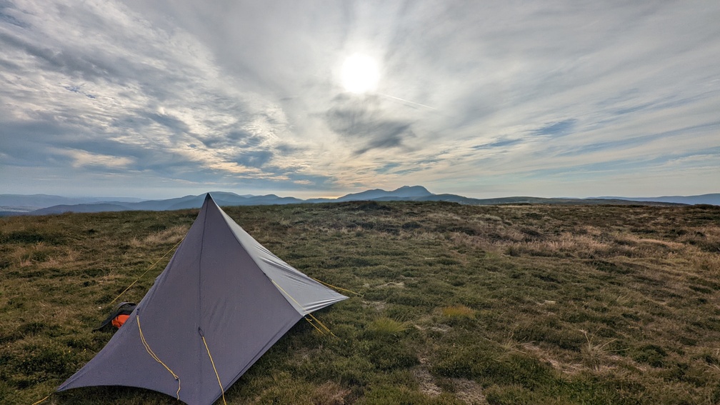I now started to look around for a spot to pitch, finding a flat enough spot halfway between the summit and the fence.