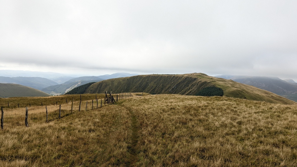 I reached the A487 and crossed over. The waymarks seemed to take me to the east of the fence running down the ridge and I cut back steeply over grass and bracken to join it. The path was on the other side, and I realised I was on the “old” path. Loads of people on the other (correct) side of the fence. All watching me.