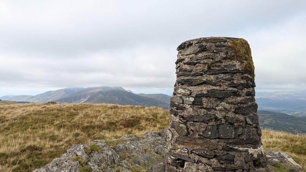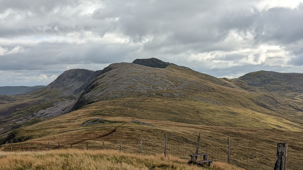 The climb onto Gau Graig is a steep scramble up a rocky gully, which was hard work with a sizeable pack on. Then a more gentle stroll alongside the fence before darting off to the right to bag the summit itself.