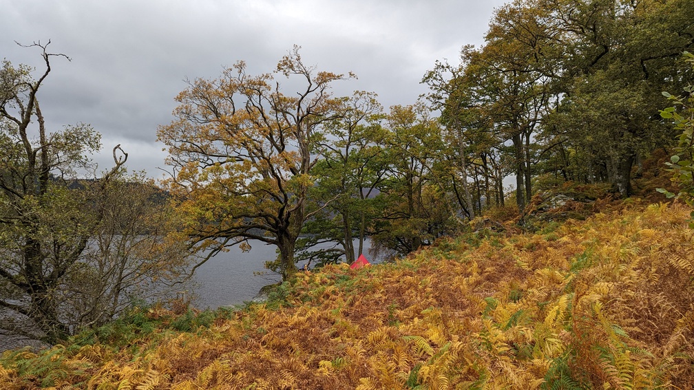 I passed a few spots I could have camped and as time was getting on, and I didn’t think I’d make Inversnaid before sunset, started taking them seriously. After rejecting several workable spots, I finally found one just off the path perched on a flat ledge above the loch. It was perfect, and I was glad I’d held out.