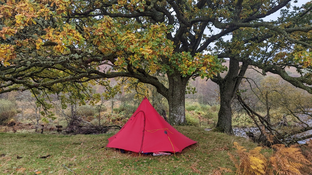 I was glad to emerge into more open terrain, and as I’d now realised I wasn’t getting especially near Crianlarich today, I also had the camp radar on. Eventually I spied a flat green patch under a tree by the River Falloch and squelched over to investigate. It would do.