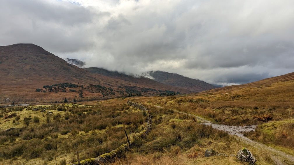 The path now led off into Glen Falloch, with the noise of the A82 growing ever closer as the gap narrowed. A lot of slipping and sliding on muddy ground between bracken and low trees that meant I couldn’t hold the umbrella up. So I had to overheat in my waterproof jacket instead.