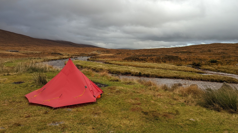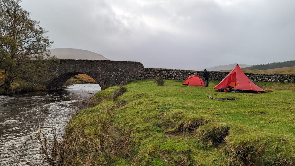 It didn’t matter much though – we weren’t going to be short of water – it just would have been nice to have some guaranteed quality in it. We pootled along to the bridge and the grassy areas each side of the road, fancying the one on the right as it afforded a bit more shelter. We were largely pitched up before the rain came.