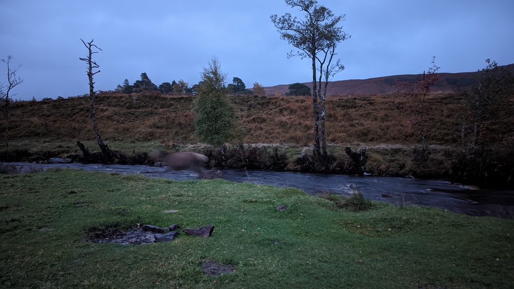 4 guys turned up later and went for the other side of the road. We found out later that they’d had a stag right up to their tents. On our part we had a deer loitering around on the riverbank in front of us. In fading light, and with a clear aversion to being photographed, it was difficult to capture…