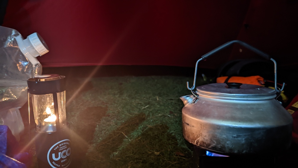 We headed for the back of the hotel to pitch, concerned about how much space there was and the fact that we weren’t first there. But we needn’t have worried – none of the people ahead of us had opted to camp – they all seemed to be in the bunkhouse (probably sensibly). We had our pick of the spots, although that’s not saying much. It was tricky to find space for two tents on flat, non-boggy ground. Somehow we managed it and headed into the hotel for some grub.