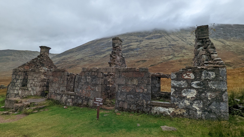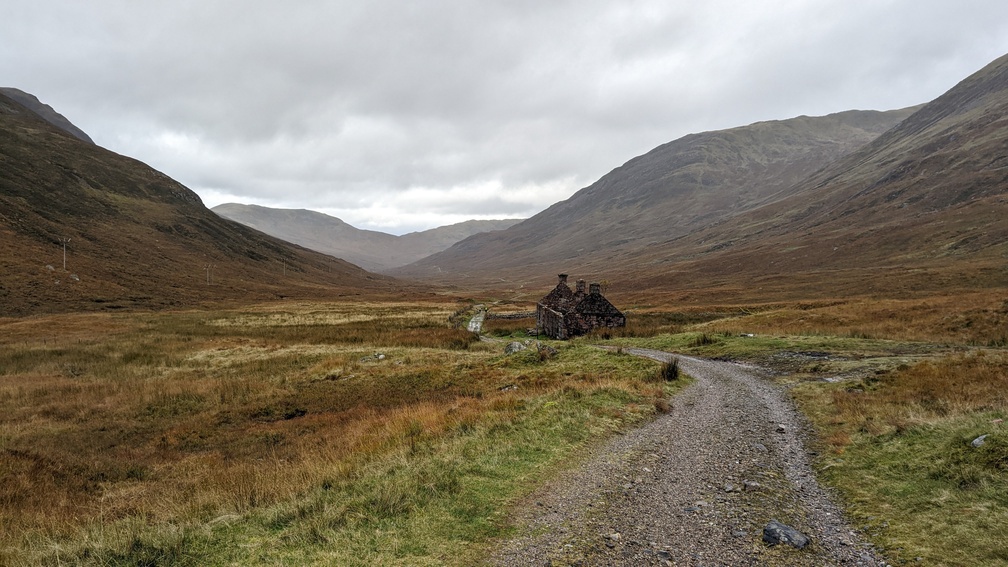 Having crested it, I allowed myself to put some music on, and then hit the long downward slope, cruising past the ruin of Tigh-na-sleubhaich and generally having a much easier time of things than last time fighting my way upwind.