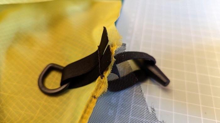 - Fabric usage: I ordered 5m of the yellow ripstop fabric and pretty much used it all. By which I mean, I was left with various triangular offcuts that won’t be much use for anything else, and very little of the main roll of fabric unused. If the build had gone wrong and I’d have wanted to redo it, I wouldn’t have had enough fabric, and would have had to cannibalise the failed one. At ā¬4 a metre, I probably could have bought more. Similarly, I used virtually all the groundsheet fabric, so wouldn’t have been able to go again without cannibalising (and hence ending up with a smaller inner). This was more expensive at ā¬8 a metre, but there’s less wastage. I did at least have some of the 1.6oz HyperD left from the previous build, although not quite enough for the size of inner I was making this time.