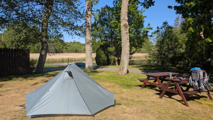 I remembered from last time I was here that the patch of ground for tents wasn’t great quality, but I’d forgotten why – it was stony and tree-rooted and consequently took an age to get tent pegs in satisfactorily.