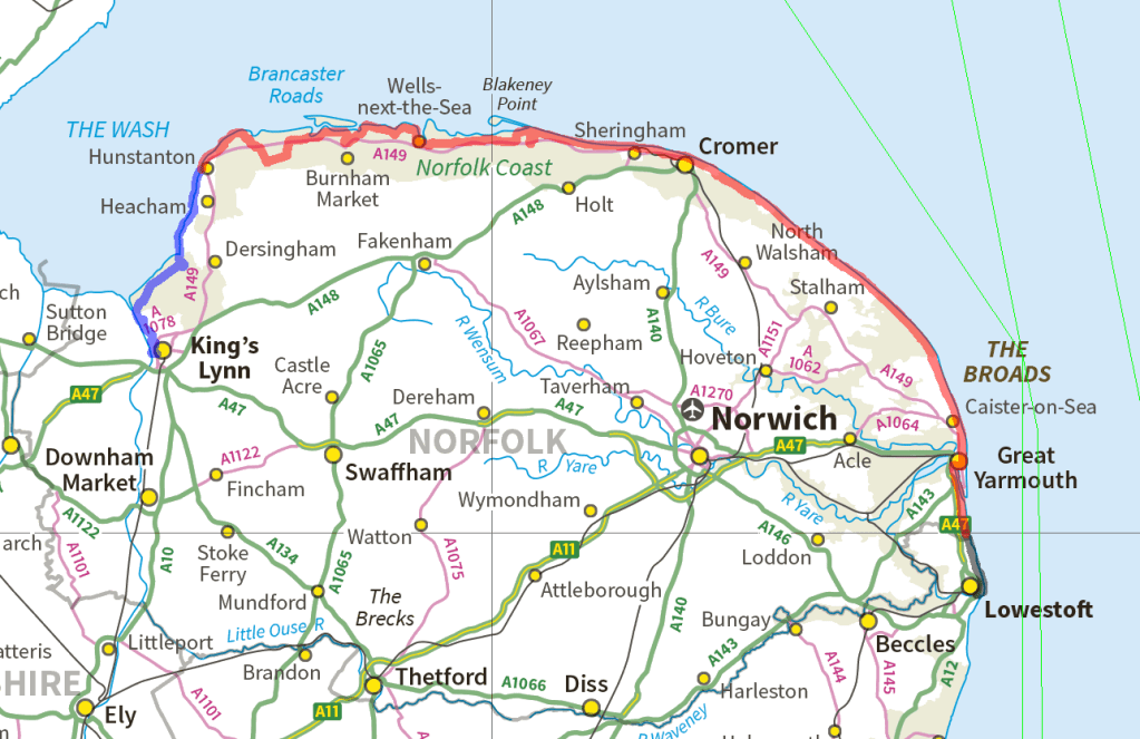 Now that you’re suitably confused, let me simplify matters. I wanted to finish the PW/NCP National Trail, having done the Peddars Way bit as the finale of my Greater Ridgeway Walk of 2023-24, and as long as I at least covered the coast between Hunstanton and Hopton, I’d manage this. But I decided to start in King’s Lynn for logistical purposes (ie there’s a station there), and rather than backtrack to Great Yarmouth at the end, I’d walk on a further 5 miles or so to Lowestoft to get a train home from there. So I’d polish off the PW/NCP as well as bit of extra ECP.