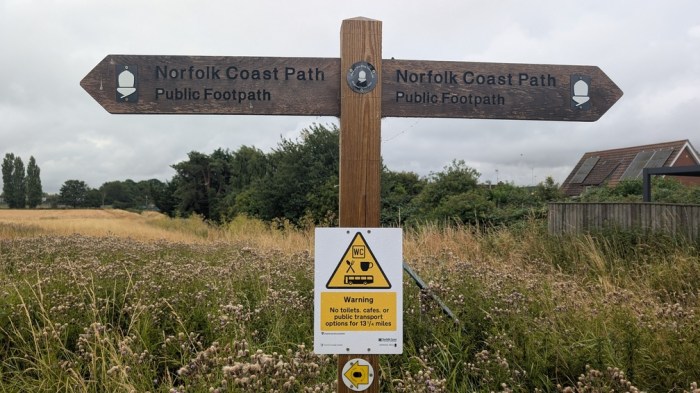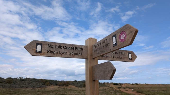 The Norfolk Coast Path (NCP) is part of the Peddars Way and Norfolk Coast Path National Trail, as well as being part of the England Coast Path (ECP) (or King Charles III England Coast Path to be technically but also pointlessly accurate). It’s signed as the Norfolk Coast Path from where I started in King’s Lynn, and with an acorn, but the acorn is for the England Coast Path. The bit of the NCP that’s included in its own National Trail (together with the Peddars Way) starts in Hunstanton and finishes in Hopton-on-Sea between Great Yarmouth and Lowestoft, but it used to finish in Cromer.