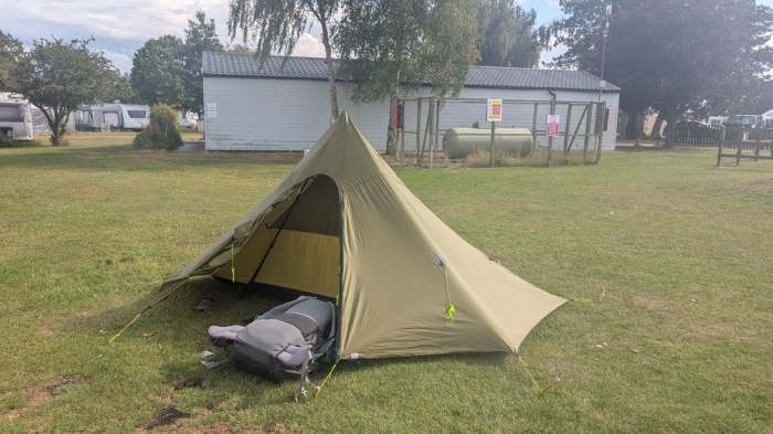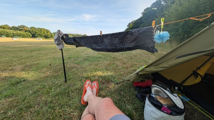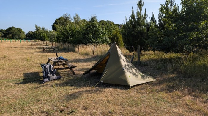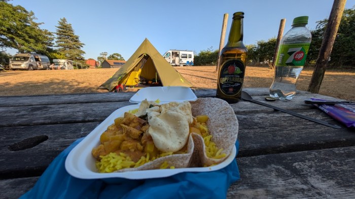 I was shown to my pitch, which somewhat disappointingly was on a slope in a small field of all campervans. The ground was a bit hard for the pegs to penetrate too. On the plus side, the little food van at the site was on curry night, so after popping to the garage next door for some liquid supplies, I was set for the night.