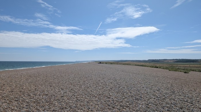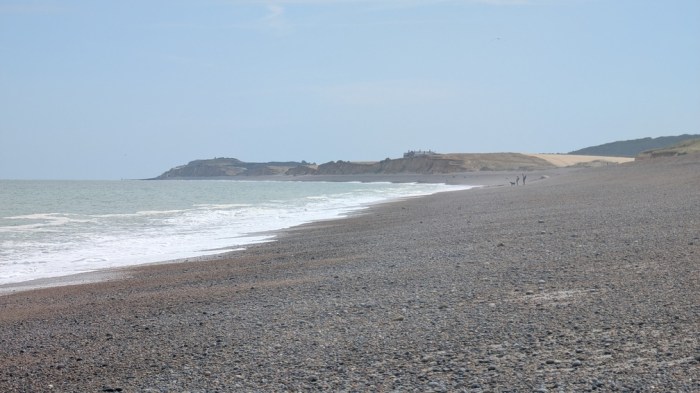 Ahead of me lay about 6km of shingle bank, which would be difficult walking, but for the fact that the tide was just out far enough to reveal a line at the bottom of the bank which was just sand covered in a single layer of stones, so being much firmer to walk on. I stuck to this all the way to Weybourne.