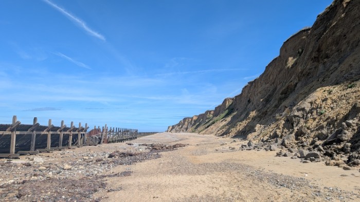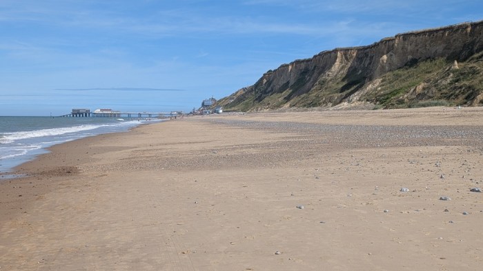 Sheringham was teeming with people, and it took me a while to find a fish and chip shop. But I did find some, and a shady bench to eat it on, before heading along the promenade until it ran out, dropping me onto the scrappy bit of beach between the cliffs and some old wooden sea defences.